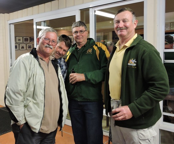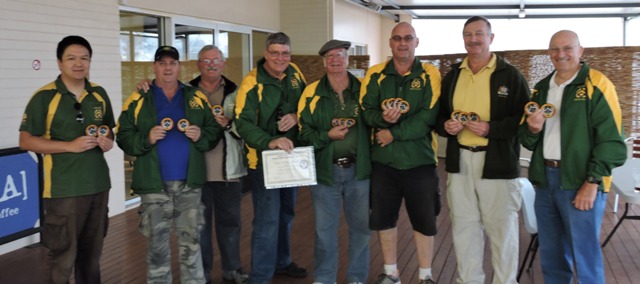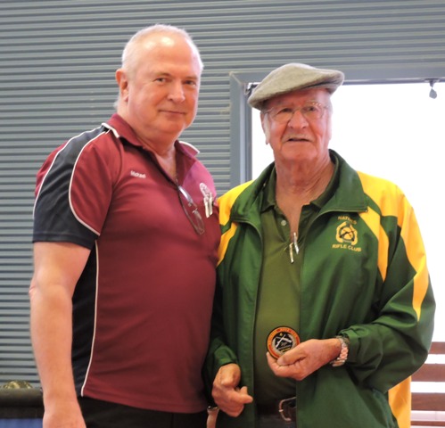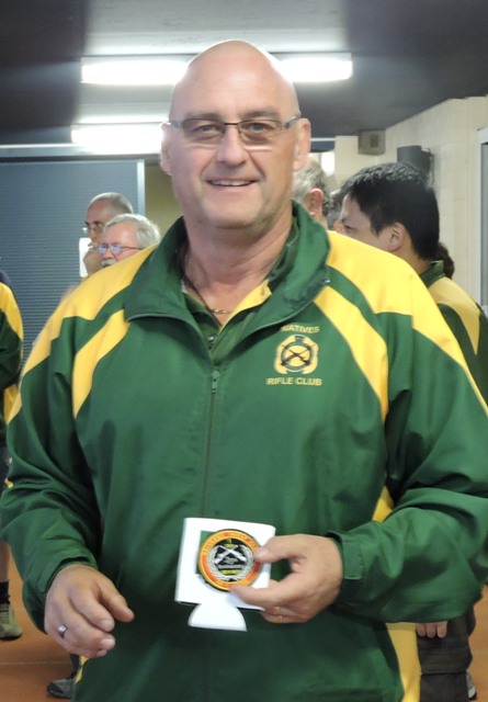 Natives Rifle Club members display their badges won at the Brisbane Rifle Club Prize Meeting. Captain, John Menzel, centre, displays the Q-Store voucher won by the Club for the club with most members in attendance (14 Natives members).